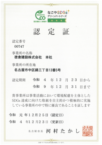 当社は、本社を「認定優良エコ事業所」として更新(平成17年3月登録)し、令和4年12月新たに本店伏見オフィスが「認定エコ事業所」として認定されました。